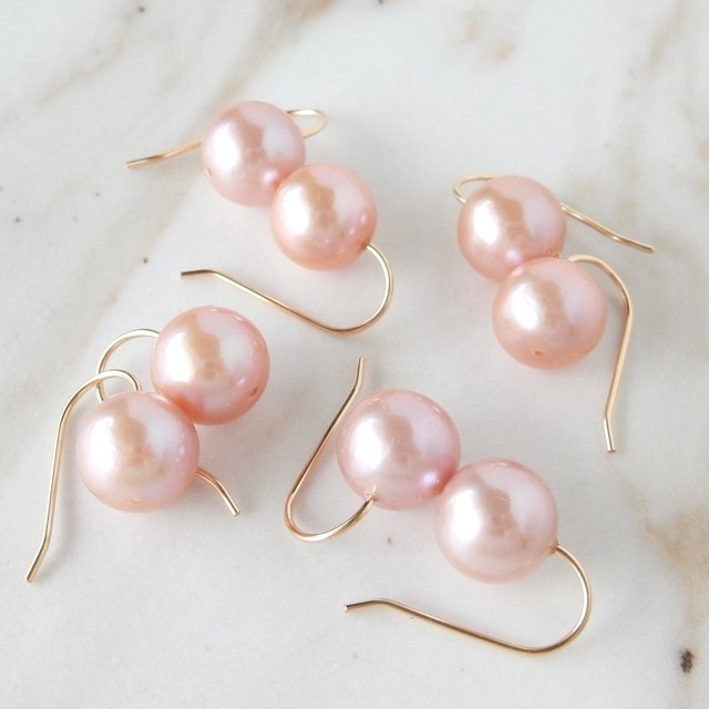 淡水パールの一粒フックピアスです。 耳たぶのすぐ下にちょこんとパールがつくようなデザインです。 9.5-10mmの大粒サイズです。 一見ラウンドですが、僅かにセミラウンド。 横サイズに対して、縦サイズが0.2~0.3mm程小さくなっています。 桜色のようなピンクに、ほんのりとピーチカラーを感じるような優しいお色です。 貝から取り出したままのお色、天然色です。 あまり目立ちませんが、部分的に少しシワがあります。 珠によりますが、ほんの小さなエクボがみられるものも。 全体的には、つるんとして高品質なパールと言えます。 一番テリが良く、美しく見える部分を前面にしています。 肌なじみのよいピンクカラーは、顔周りをふんわりと優しく明るい雰囲気に。 ホワイトとはまた違った合わせやすさ、使いやすさがあるのでオススメです! ランダムでお届けしますが、選んでいただくことも出来ます。 お気軽にお問合せください。 *両穴のパールを使用しています。(下になる部分に穴があります。) 見えない部分ですが、丁寧に接着剤で埋めています。 〚材料〛 淡水パール 14kgf *落下防止の為、シリコンキャッチをお付けしています。 ◎ご購入の前にショッピングガイドをご確認ください。 ラッピング、配送、お修理、その他ご注意事項などについて記載しております。