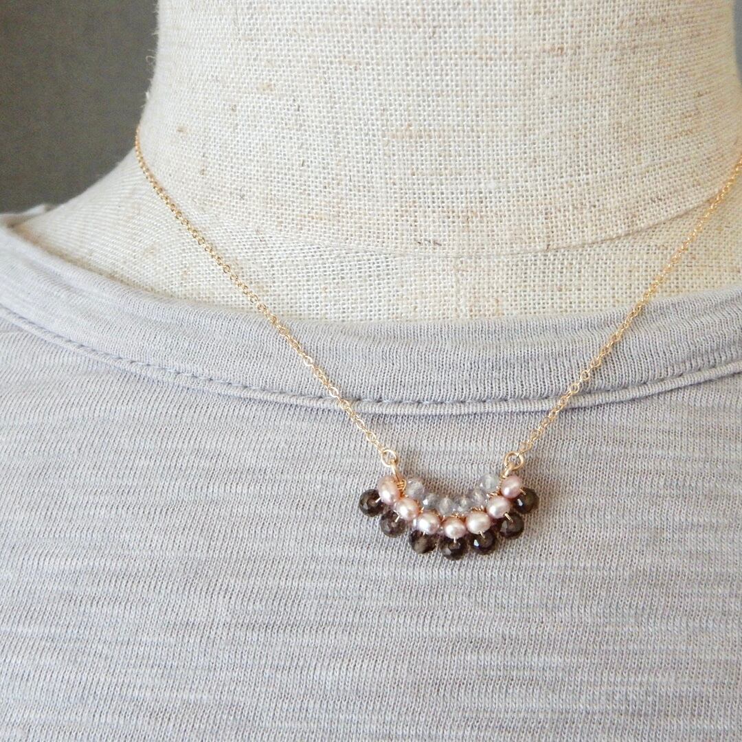 淡水パールと天然石のファン(扇型)ネックレスです。