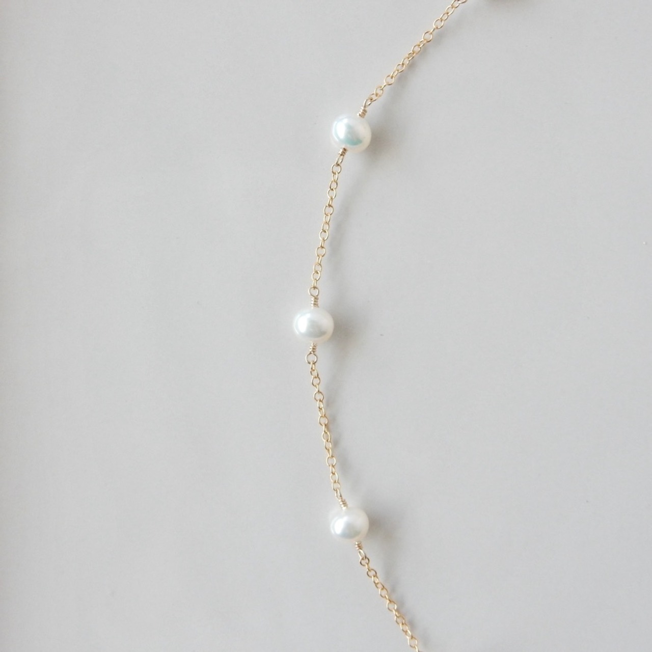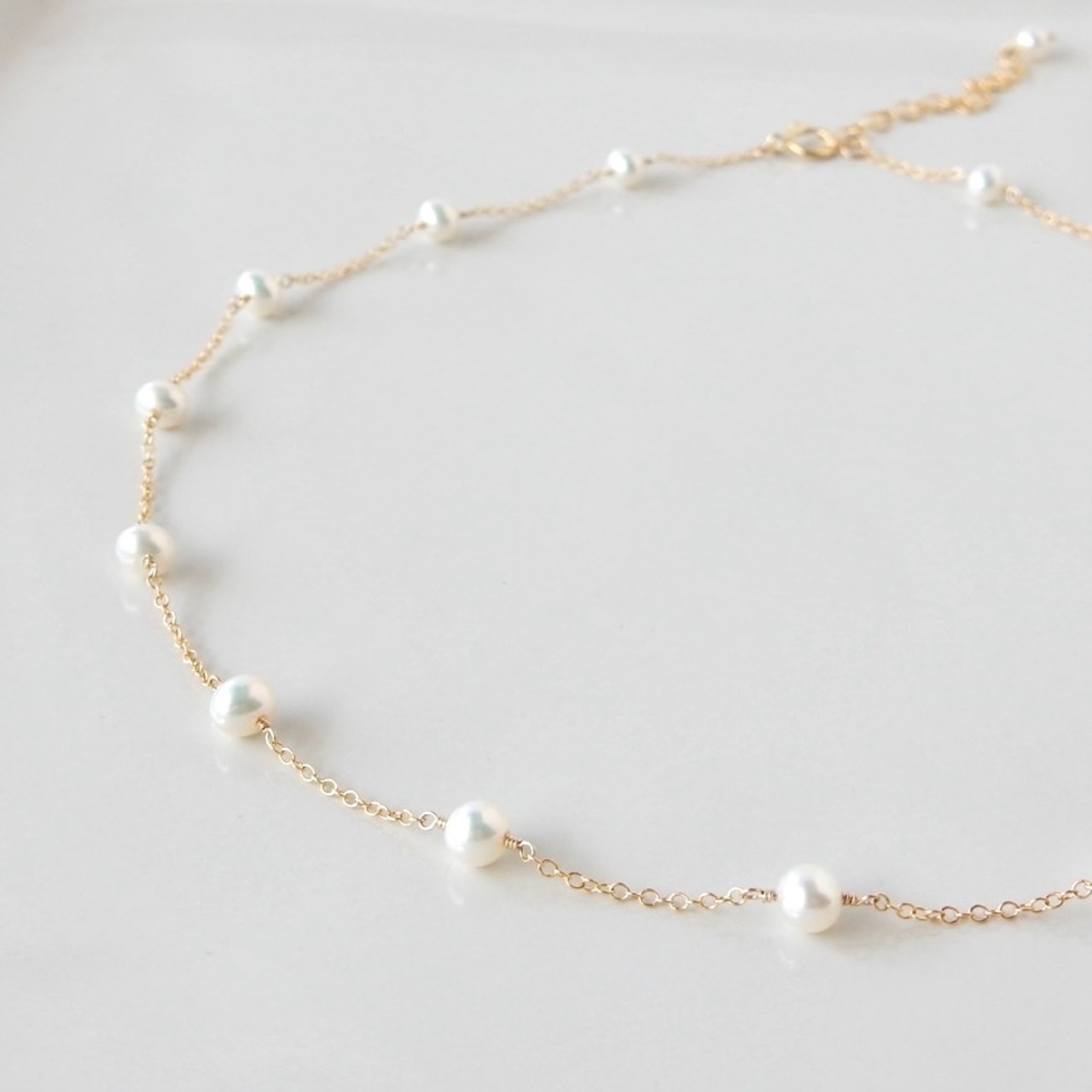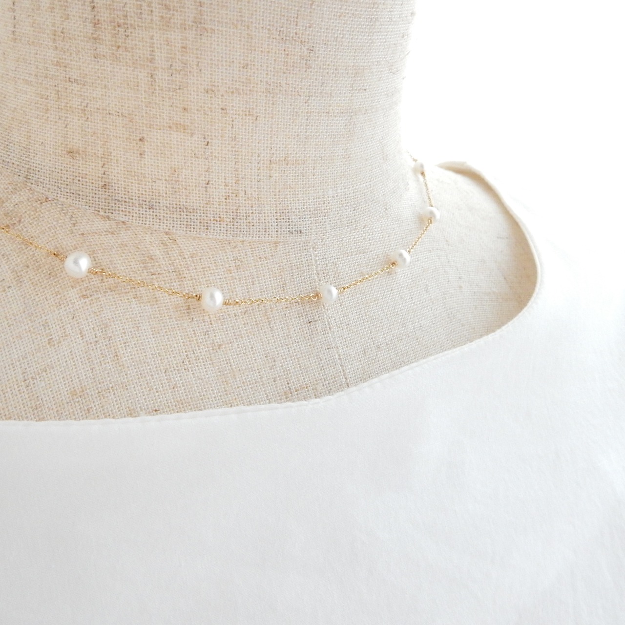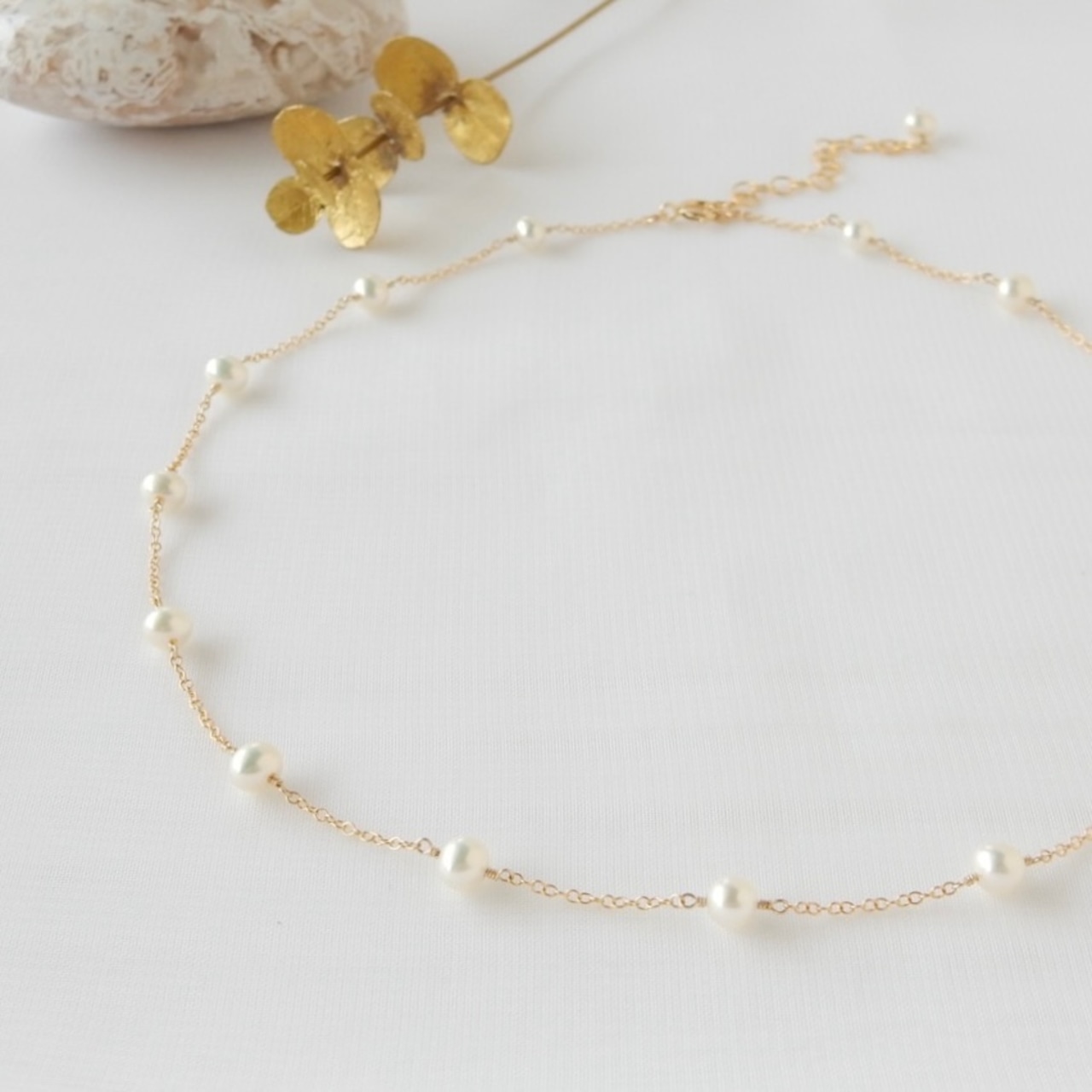 また、華奢なチェーンで繋ぐパールネックレスは軽い印象なので